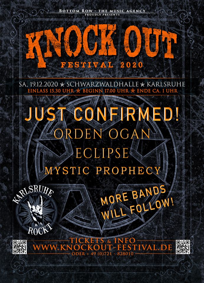 A Knock Out erős felhozatala mellett vonzó dolog, hogy a fesztiválhoz közel van a város karácsonyi vására, így az emelkedett hangulat könnyen megalapozható egy kis forralt borral. Az első nevek várhatóan még nem a fesztivál húzónevei, de már most is erősnek ígérkezik a felhozatal, így várhatóan idén is tömegek lesznek a Schwarzwaldhalléban. A 2020. december 19-én megrendezésre kerülő fesztivál három bejelentett zenekara az Orden Ogan, az Eclipse és a Powerwolfba folyamatosan beugró Markus Pohl zenekara, a Mystic Prophecy. További nevek hamarosan!