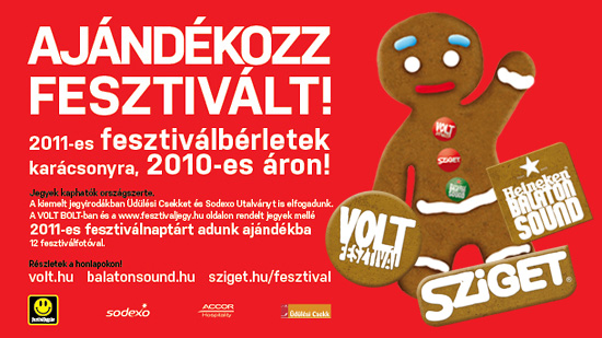 2010-es áron, 2011-es Sziget, VOLT Fesztivál és Heineken Balaton Sound bérlettel lephetik meg szeretteiket azok, akik már karácsony előtt bérletet vásárolnak hazánk legfontosabb fesztiváljaira. A karácsonyi akcióban ajándék is jár a bérletek mellé!