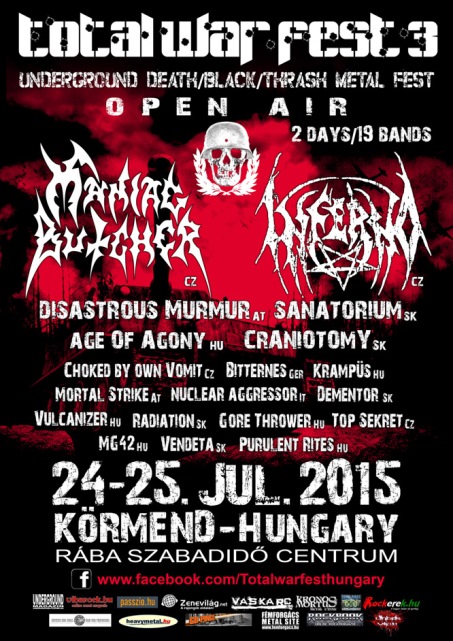 Idén már harmadjára kerül megrendezésre Magyarország egyetlen szabadtéri underground Death/Black/Thrash Metal fesztiválja Körmenden, a Rába folyó partján, hangulatos környezetben, sátorozási és strandolási lehetőséggel. Ez lesz a nemzetközivé bővített Total War fesztivál. Friss hír, hogy a cseh Maniac Butcher nem tud részt venni a feszten, így szombaton az 1989-ben alakult finn Archgoat lesz a főbanda. A 2004 óta ismét aktív black/death vonalas Archgoat januárban adta ki a legfrissebb albumát.