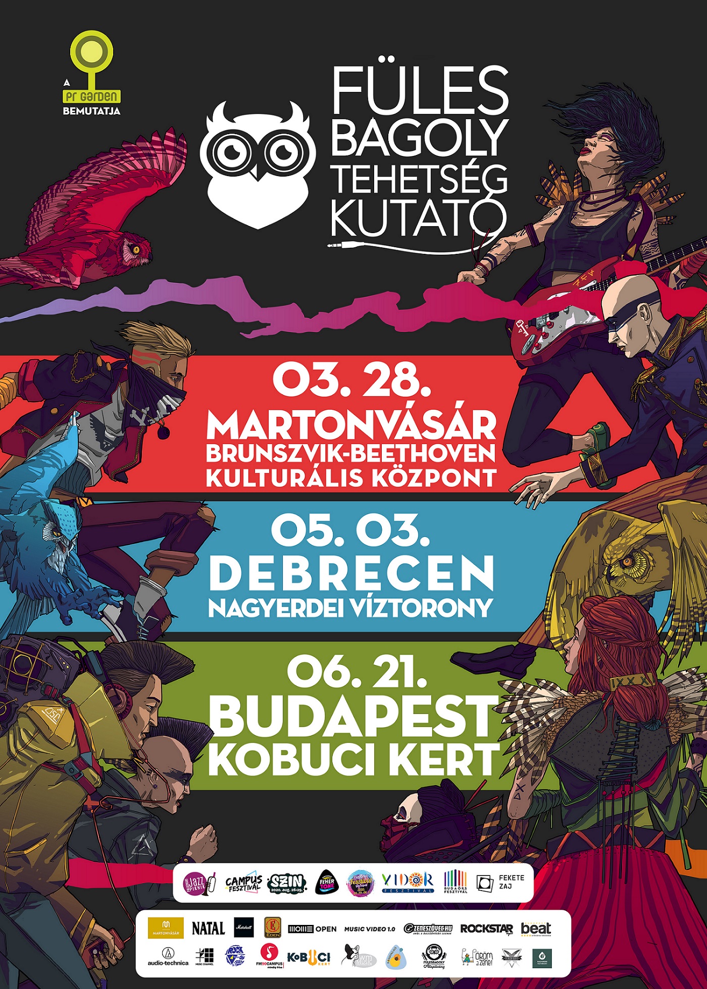 Az idei első Fülesbagoly Tehetségkutató március 28-án lesz Martonvásáron, a Brunszvik-Beethoven Kulturális Központban, a második május 3-án Debrecenben, a Nagyerdei Víztorony kertjében, míg a harmadik június 21-én Budapesten, a Kobuci Kertben.