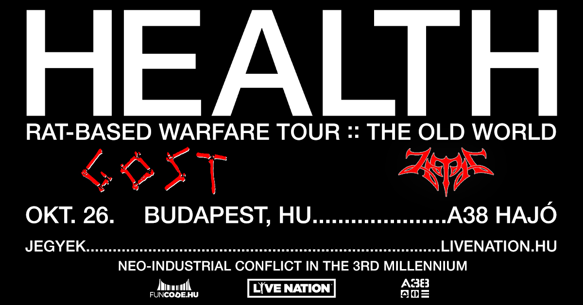 A Los Angeles-i industrial-rock zenekar, a Health éppen csak lelépett a Budapest Park színpadáról, ahol a Bring Me The Horizon vendégeként játszottak, máris bejelentette őszi budapesti koncertjüket, ugyanis október 26-án önállóan is visszatérnek, hogy az A38 Hajón mutassák be Rat Wars című friss albumukat.
