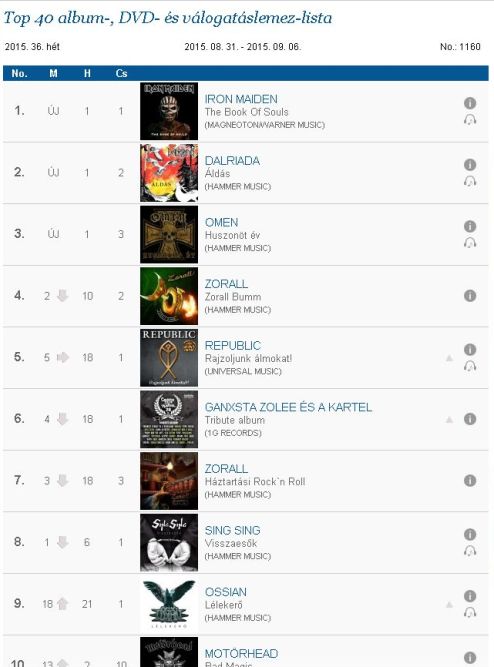 Ahogy arra számítani lehetett, a szeptember 4-én megjelent Iron Maiden lemez, a The Book of Souls azonnal a Mahasz lista élére állt, de a Dalriada, és az Omen legújabb albumainak (Áldás, illetve Huszonöt év; mind a kettő szeptember 7-én jelent meg) nem kell szégyenkezniük, hiszen ezek követik a Maiden albumát ebben a sorrendben. Mivel a top30-ban megtalálható a többi Dalriada korong, így az együttes a legerősebb nyitást könyvelheti el. Mi rockerek sem szégyenkezhetünk, ugyanis a Top 10-ben további két Zorall, a visszatérő Sing Sing, az új Motörhead és az Ossian legutóbbi platinalemeze is helyet követelt magának.