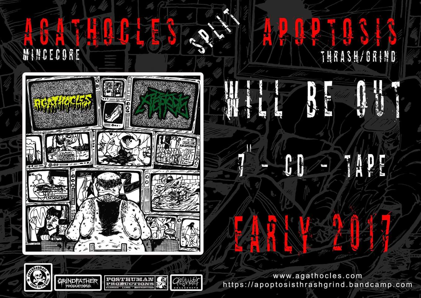 A mai napon egy Agathocles-szel közös split anyaggal jelentkezett a 2015 szeptemberében alakult thrash/grind vonalas szegedi Apoptosis. A kiadvány kazetta, CD és 7″-es vinyl formátumokban jelenik meg a következő kiadóknál: Everydayhate Records, Greywater Collective, Posthuman Productions, Grindfather Productions. A Jack, Gravecrusher és Alcoholic Terror tagokból álló Apoptosis legközelebb február 17-én hazai pályán, a szegedi Cool Clubban zúz a színpadon, A friss split Social Trap című dalához klip is készült.