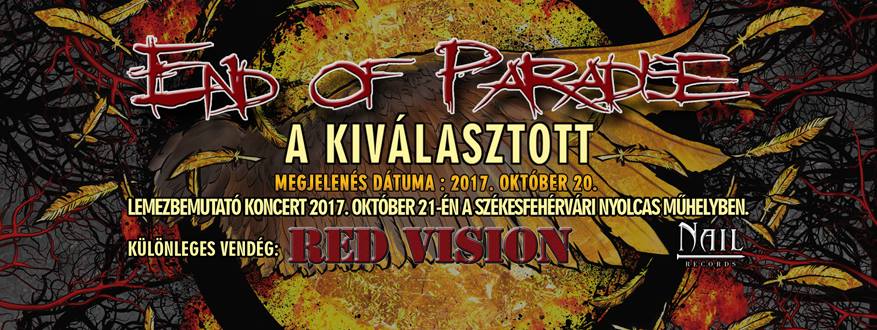 A kiválasztott. Ez a címe a székesfehérvári End of Paradise új lemezének, mely október 20-án, azaz most pénteken a Nail Records gondozásában lát majd napvilágot. A korongra 9 dal került, melyből kettő már meghallgatható a zenekar Youtube csatornáján. A lemez előrendelhető a zenekar weboldalán – http://www.endofparadise.hu/ – vagy ezen az emailcímen: rendeles@endofparadise.hu. Két akciós csomag közül választhatnak a rajongók, de csak már néhány napig: