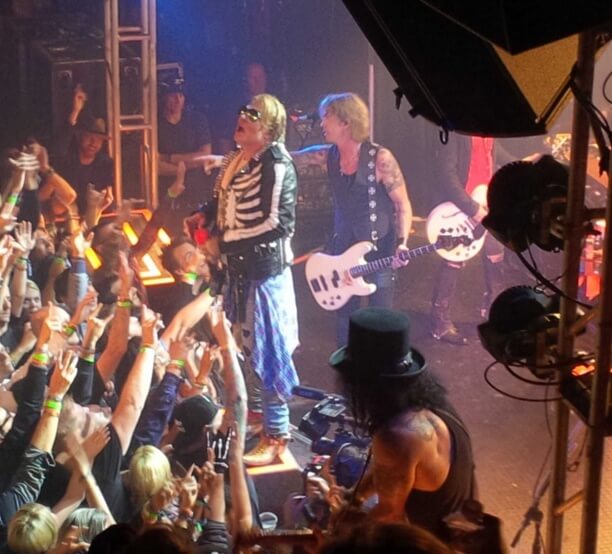 Április elsején megtörtént a nagy visszatérés: huszonhárom év után újra egy színpadon zenélt a klasszikus Guns N’ Roses három oszlopos tagja, W. Axl Rose, Slash és Duff McKagan. A meglepetés bulinak az a a hollywoodi Troubadour klub adott otthont, ahol 1985 június elején első ízben lépett színpadra a klasszikus ötös felállás. Most azonban Izzy Stradlin gitáros és Steven Adler dobos nem voltak jelen, helyettük Frank Ferrer volt a dobos, a másik gitáros Richard Fortus, a billentyűs Dizzy Reed, illetve volt még egy billentyűslány, Melissa Reed (aki Chris Pitman helyén játszott.). A négyszáz férőhelyes Troubadour klubban természetesen zsúfolt teltház jött össze, a setlistből pedig kiderült, hogy a klasszikus GN’R-éra mellett arról a Chinese Democracy lemezről is játszottak dalokat, amelynek megírásában Slash és Duff nem vettek részt.