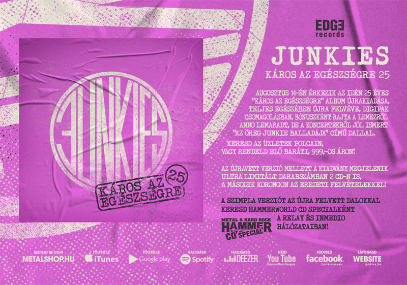 A zenekar egy új kiadvánnyal is készül, augusztus 14-én érkezik az idén 25 éves “Káros az egészségre” album újrakiadása teljes egészében újra felvéve, digipak csomagolásban bónuszként rajta a lemezről anno lemaradt, de a koncertekről jól ismert “Az öreg junkie balladája” dallal. Az újravett verzió mellett a kiadvány megjelenik ultra limitált darabszámban 2 CD-n is, a második korongon az eredeti felvételekkel! A szimpla verziót az újra felvett dalokkal a ReLay és InMedio hálózataiban is meg lehet vásárolni HammerWorld CD Specialként.