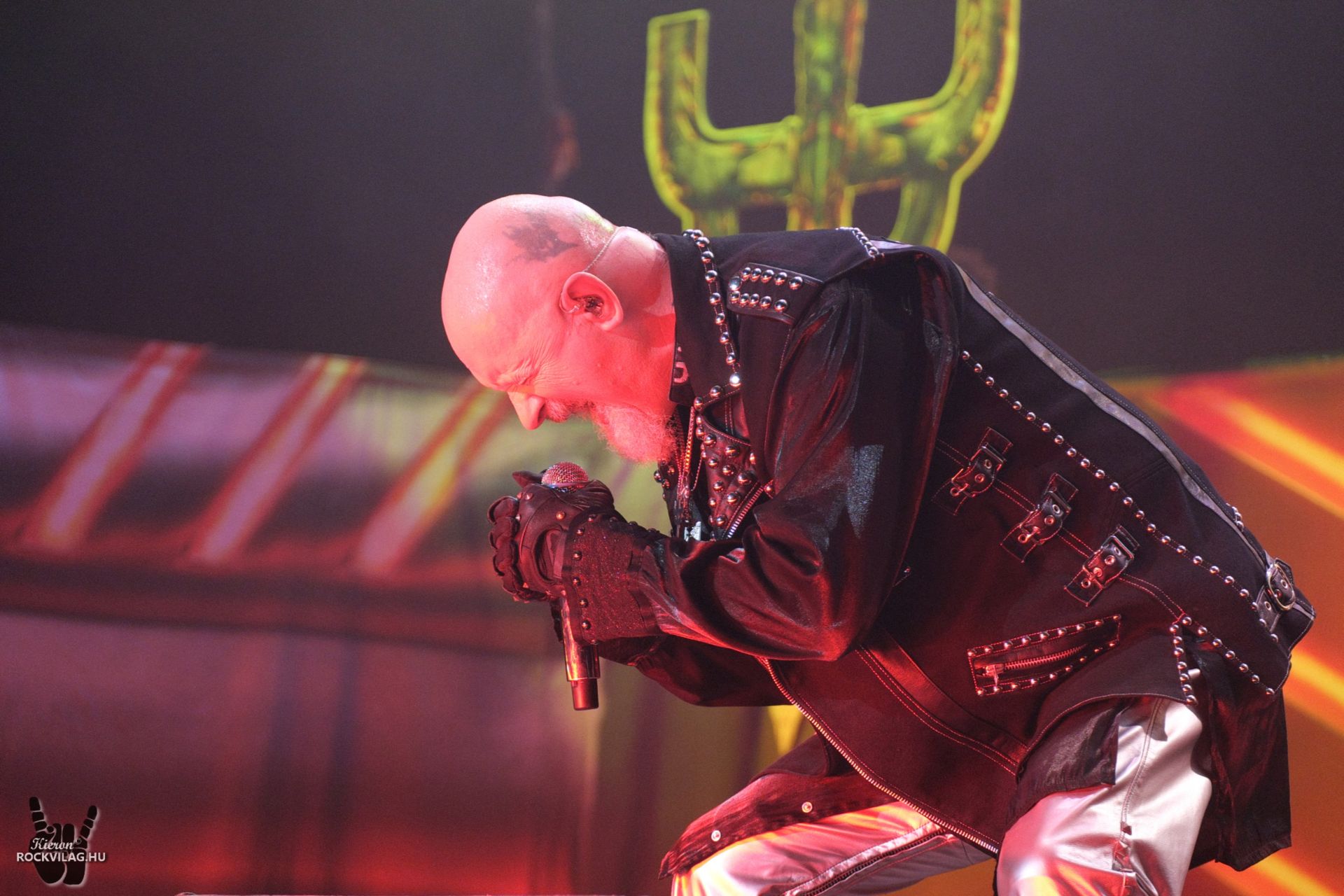 Befejezvén a magyarok fellépését, jött a szorgos staff, sürögtek-forogtak a színpadon. Hamar át is rendeződött a kép, majd egy hatalmas, Priest szimbólummal ellátott molinót aggattak elénk, ahogy azt már megszokhattuk a korábbi koncerteken is. Annyi változott rajta, hogy telis-tele van rakva különböző dalszöveg-részletekkel a banda repertoárjából. Megjegyzendő, hogy itt az átszerelés során már korrekt zenék szóltak. Aztán hirtelen felcsendült a War Pigs, mely mint sokan tudják a koncert kezdése előtti utolsó dal. Fel is élénkült a tömeg, a híres Sabbath himnuszt, a felénél elvágták, majd jött a Firepower intrója, és BUMM, lezuhan a molinó, majd a színpadon ott áll a Judas Priest. Akinek ismerős az érzés, kár szavakba önteni, hogy ez az első néhány pillanat/perc milyen extázisba tudja hozni a vérbeli rajongót. Én egy darabig fel sem fogtam, hogy a szemeim előtt zajlik az, amire oly sok hónapon át lelkesen vártam. És mégis – ott vannak a színpadon, a Firepower pedig üvöltve hasítja a levegőt. Ezen a turnén több olyan dalt is elővettek a múltjukból, amiket egyébként nem játszottak túl sűrűn. Ilyenek például a rögtön második Grinder, a Sinner, a Bloodstone, a Saints in Hell, valamint a számomra csúcspontot jelentő Tyrant és az utána következő Night Comes Down. De említhetném még a Freewheel Burning-et, és az új album számomra legkedvesebb dalát, a Rising From Ruins-t is. Tehát a setlist bővelkedik igazi finomságokban, és bár korábban játszották a Some Hands Are Gonna Roll című tipikus 80-as évek hangulatú szerzeményüket is, amiben erősen reménykedtem, ez már néhány állomás óta nincs a programban – de panaszra abszolút nincs semmi ok. Mindamellett pedig, hogy milyen jól válogatták össze a dalokat, a teljesítmény is abszolút hibátlan volt (persze az összkép, mert néhány baki mindig van – de hát erről szól az élő show). Rob kifejezetten jó formában van, a 2015-ös Fezenhez képest érezhetően jobban odafigyel a stúdióminőség megközelítésére. Bár hozzátenném, hogy – mint azt gondolom sokan észrevették – több dalban is a dallamot már másképp énekli, mint ahogy az a lemezen van, de ettől függetlenül ugyan úgy élvezhető a performansz. A 2011-es Sziget fesztiválos koncerten is ott voltam, de arról az emlékeim sajnos kicsit megkoptak már, így nem tudok összehasonlítást felhozni. Aztán ott van még Richie, aki így néhány év elteltével már nagyon szépen beilleszkedett a zenekarba. Ő is hozta a szokásos top formáját. Ian Hill az évtizedek óta megszokott nézői jobb hátsó részen műveli brummogását, Scott Travis pedig szolidan, sőt könnyedén játssza a témákat. A kakukktojás itt nyilván Andy Sneap, aki csak március óta, a turné kezdete óta van egy színpadon a bandával. Eleinte, még az amerikai állomásokon a gitárjátékán érezhető volt, hogy a dalok nagyját nemrég tanulta csak meg, és sokhelyütt döcögősen mennek neki a szólók, de mostanra már egész szépen belerázódott a szerepbe, és bár kissé félszegen (ami érthető), de korrekt módon pengeti végig a műsort.