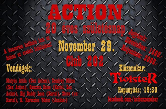 20. szülinapját ünnepli az Action zenekar, és szintén 20 éves az Összeomlás című lemez is. A november 29-én megrendezendő születésnapon viszont nem csak ennek a lemeznek a dalai, de a zenekar legnagyobb slágerei is felcsendülnek majd. Igazi csemege, hogy, a szülinap alkalmából a színpadon újra látható lesz az eredeti felállás. Matyi 95-ös kiválása óta nem lehetett látni és hallani így a ezt a formációt egy színpadon játszani. A vendégek sorát erősíti még Ganxsta Zolee, Big Daddy Laca és Steve is, és egy külön blokkban a színpadra is állnak majd. A koncerten fellép még H. Keresztes Viktor is, az Action egykori dobosa, aki most a Junkies sorait erősíti.