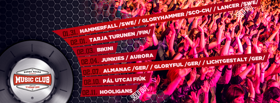 Érkezik a Nightwish egykori énekesnője, TARJA TURUNEN, őrült farsangra készül a platinalemezes ROAD és az ISMERŐS ARCOK, jubileumi 15 születésnapját ünnepli a ZORALL, felejthetetlen Valentin napot ígér a HOOLIGANS, új lemezét mutatja be az AURORA, a JUNKIES és a HOLLYWOOD ROSE. Metálban sem lesz hiány, önálló turnéval jön a német szupergroup, az ALMANAC és a kanadai operametál-zseni, DEVIN TOWNSEND. Először üdvözölhetjük hazánkban az amerikai Tanner Petulla, azaz GETTER-t, aki a brit FUN CASE és a belga EPTIC társaságában érkezik. De fellép még a PÁL UTCAI FIÚK, a F.O. SYSTEM, a BIKINI, de a legnagyobb AC/DC slágerekre is zúzunk. Bitang jó programot hoz a február a Barba Negrába, veled melyik koncerten találkozunk?