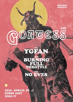 Április 29-én a Dürer Kertben lép fel a svéd Goatess. A hipnotikus doom/sludge-alapú muzsikában utazó zenekart az Ygfan, a Burning Full Throttle és a No Eves kíséri. A korábbi Saint Vitus és Count Raven, jelenlegi Lord Vicar-énekes Chritus Linderson vezette svéd Goatess először lép fel Budapesten. Őkecskesége nem tisztán tradicionális doom metalt játszik: van benne az is, de nagyjából ugyanannyira jellemző rá a sivatagi rockzenéktől megörökölt transzcendentális hipnotikusság és a sludge tonnás súlya is. Másképp szólva, stílusukra a Black Sabbath mellett a Sleep, az Acid King, vagy a Kyuss is nagy hatással volt.