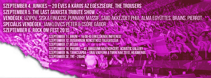 A hatalmas kánikulát legyőzve, mielőtt bevonulnánk újra a klubba, még pár igazán kellemes estével kecsegtet a Barba Negra Track. Az idei utolsó etapot szeptember 4-én a Junkies nyitja, akik Káros az egészségre című, sokak életében meghatározó szerepet betöltő albumuk megjelenésének 20. évfordulóját ünneplik egy hatalmas bulival. Ugyanezen tiszteletre méltó, kerek szám apropóján lép a deszkákra másnap a Ganxsta Zolee és a Kartelis. Idén már jó pár alkalommal találkozhattunk a Ganxsta Tribute koncertsorozattal, az utolsó felvonás pedig igazi sztárparádéval, és minden eddiginél erősebb programmal kecsegtet: itt lesz az Uzipov, Siska Finuccsi, a Punnany Massif, Saiid Akkezdet Phia, az Alma Együttes, a Brains képviseletében Lukács Levi, Pierrot, valamint különleges vendégként Janklovics Péter & Csőre Gábor is. És hogy lehet-e még mindezt fokozni? Naná! Szeptember 6-án a helyszínen eddig sosem látott mennyiségű, közel 30 zenekar veszi be a Track-et a Rock On! Fest 2015 keretei között. Dalriada, Omen, Kalapács József, Auróra, Nevergreen, Hungarica, Pandora’s BOX – P. BOX, Tűzmadár zenekar, Cool Head Klan, Agregator, Salvus – csak hogy pár nevet említsünk az egész napos, ingyenes, dedikálásokkal és albummegjelenésekkel fűszerezett eseményről.