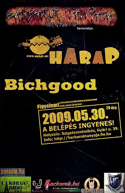2009. május 30-án Szigetszentmiklóson, a Barbárok Tanyájában lép fel a Bichgood és a Harap. A koncert 20 órától kezdődik, a belépés pedig ingyenes lesz!