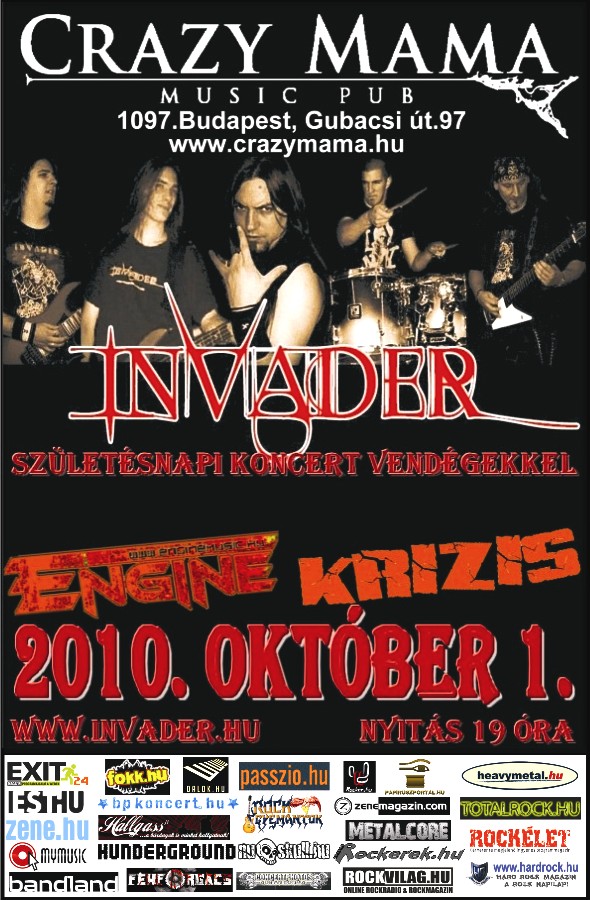 Vendégekkel (Rubcsics Richárd és Wéber Attila – az Ossian zenekarból), a 2010-es EP anyagával és ahogy ők mondják, „már nem is annyira új” tagjaival várja rajongóit október 1-én, pénteken az Invader legénysége! Profi muzsika, fantasztikus házibuli hangulat, igazi ünnep lesz a csapat 5. születésnapi koncertjén. Az adrenalin felszabadításáért az Engine és a Krizis vállalta a felelősséget! Mindenkit szeretettel vár a Crazy Mama Music Pub!
