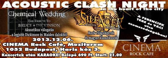 December 6-án egyszerre két eseménynek ad helyet a Cinema Rock Cafe! A moziterem könnyedebb hangvételre hajlik, s két akusztikus előadással várja vendégeit, míg a koncertteremben táncra perdítő dallamok csendülnek fel. A ’csendesebb verzió’ kínálatában szereplő Chemical Wedding kifejezetten Bruce Dickinson munkásságára helyezte a hangsúlyt, s mindezt időnként akusztikus formában szolgáltatja a nagyérdemű számára, megtűzdelve pár ritkán hallható szerzeménnyel a vasszüzek szerzeményei közül. A szintén sokat tapasztalt tagokból álló trió, avagy az Acoustic Silencer pedig a legnagyobb magyar és külföldi rock slágerek kicsit másként címszóval szolgáltat kellemes zenei élménnyel a hallgatóság számára. Mindeközben az alsó szinten mozgásra buzdító ritmusvilágot kínál a Magic Rock Cats Rockabilly trio által képviselt rockabilly őrület, valamint (morbid humorral) átitatott magyar zenetörténeti áttekintés a Timur Lenk produkciójával. Aki a koncertek után még korainak érzi a távozást, akár saját maga is mikrofont ragadhat a hajnalig tartó karaoke folyamán!