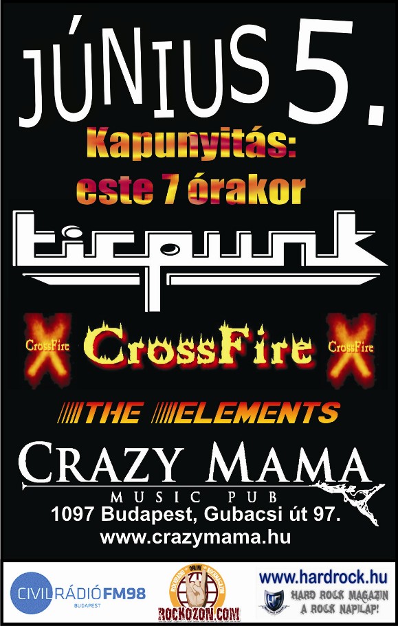 „Punk-rock from Mosonmagyaróvár”! – ez a Tirpunk szlogenje! Nem kétséges, igazi szórakozást kínál az „Őrült hölgy” a következő péntekre! Felszabadult, magával ragadó, felhőtlen hangulat lesz június 5-én este, a Crazy Mama színpadán. S akik ebben még közreműködnek: a Crossfire és (a) The Elements!