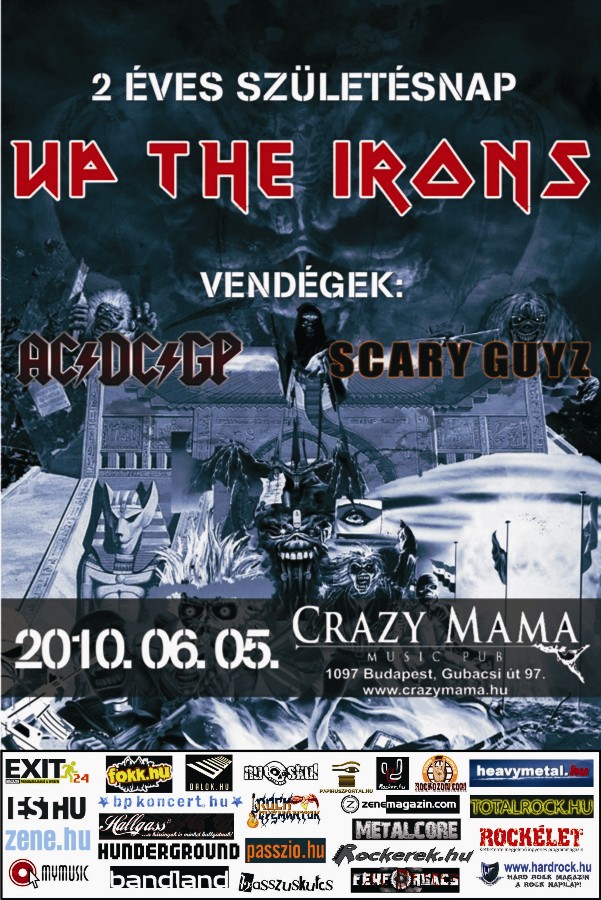 Ismét egy hétvége, ismét egy felejthetetlen élmény! Ez várja a Crazy Mama Music Pub közönségét ezen a hétvégén is! Pénteken, a 2. születésnapját ünneplő PUTTONYHIT-ROCK formáció győzi meg a látogatókat arról, hogy van még miről beszélni a rock műfajban, segítségül – mint előzenekar – a JENYISZEJ konkretizálja az estét. Szombaton pedig hazánk elismert Iron Maiden tribute zenekara, az UP THE IRONS lép a deszkákra, akik annak ellenére, hogy a bemelegítő bandák az utolsó pillanatban – technikai okok miatt – mégsem tudták vállalni, hogy felfűtsék a hangulatot, változatlan erőkkel készülnek a bulira. S hogy ki vagy kik lesznek, akik felhevítik a nagyérdemű hormonháztartását? Ez legyen meglepetés! Szeretettel vár mindenkit a Crazy Mama Music Pub!