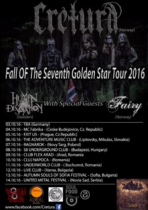 Mennyire kedvelitek a horrormetalt? A 2010-ben Bergen városában alakult norvég CreTura a saját bevallása szerint ezt műveli. 2012-ben adták ki debütáló albumukat Monsters Of Wonderland címmel, majd ezt követte egy évvel később a When The Dead Goes To Dance. Harmadik nagylemezük idén áprilisban jelent meg Fall Of The Seventh Golden Star címmel. Októberben a zenekar lenyom egy 12 állomásos európai turnét, melynek lesz magyar állomása is. A helyszín a  budapesti S8 Underground Klub lesz és október 8-án a CreTura mellett a svéd Human Desolation (melodic death metal), a norvég Fairy (melodic rock / metal), az osztrák Avem (progresszív metal) és két hazai banda, a Green Hell (thrash metal) és a Wrath Of Azazel (black metal) is tiszteletét teszi majd.