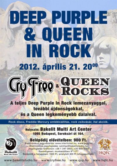 A Queen és a Deep Purple legütősebb oldalát mutatja be tehát a Queen Rocks és a Cry Free egyesített csapata 2012. április 21-én. Az esemény helyszínéül pedig a IX. Soroksári út 164. sz. alatt található Bakelit Multi Art Centert választották a koncert szervezői, amely tágas nagytermével, magas színvonalú hang- és fénytechnikával felszerelt nagyszínpadával és kreatív szabadságot sugárzó közegével tökéletes háttérnek ígérkezik a produkció számára. A Bakelit is szeretne hozzájárulni a koncertlátogatók önfeledt szórakozásához a kedvező jegyvásárlási konstrukciókkal és a számtalan vonzó italakcióval. A koncertek után pedig rock disco marasztalja majd az egybegyűlteket, akiknek nem kell az órájukat nézni bulizás közben, ugyanis az éjszakai járat félóránként indul a bejárat előtti megállóból.