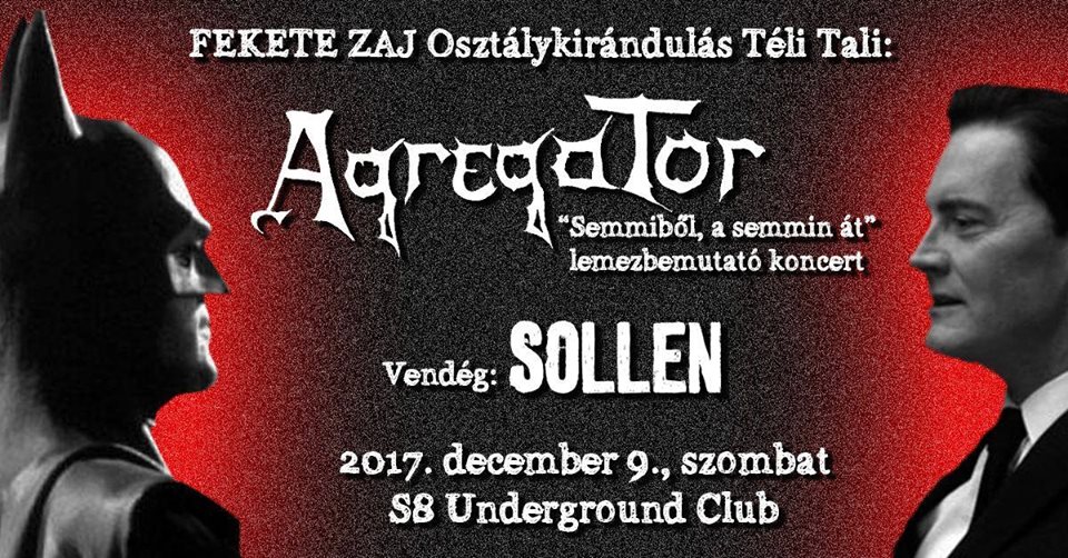 Nehéz ám kibírni egy teljes évet a Fekete Zaj nélkül, így félidőben beiktatunk egy téli osztálytalálkozót! December 9-én a fővárosi S8 Underground Club ad otthont az összejövetelnek, ráadásként erre az időpontra esik az Agregator„Semmiből – a semmin át” lemezbemutató koncertje is. Hogy hűek maradjunk a hangulathoz, a szintén skandináv metalt játszó Sollen is csatlakozik az eseményhez. Az este során a Red teremben megtekinthető a IV. Zajképek Kiállítás – gyűjtemény a Fekete Zaj Osztálykirándulások fényképeiből. A hangverseny után pedig rockbuli egészen hajnalig, a legsötétebb zenékkel!