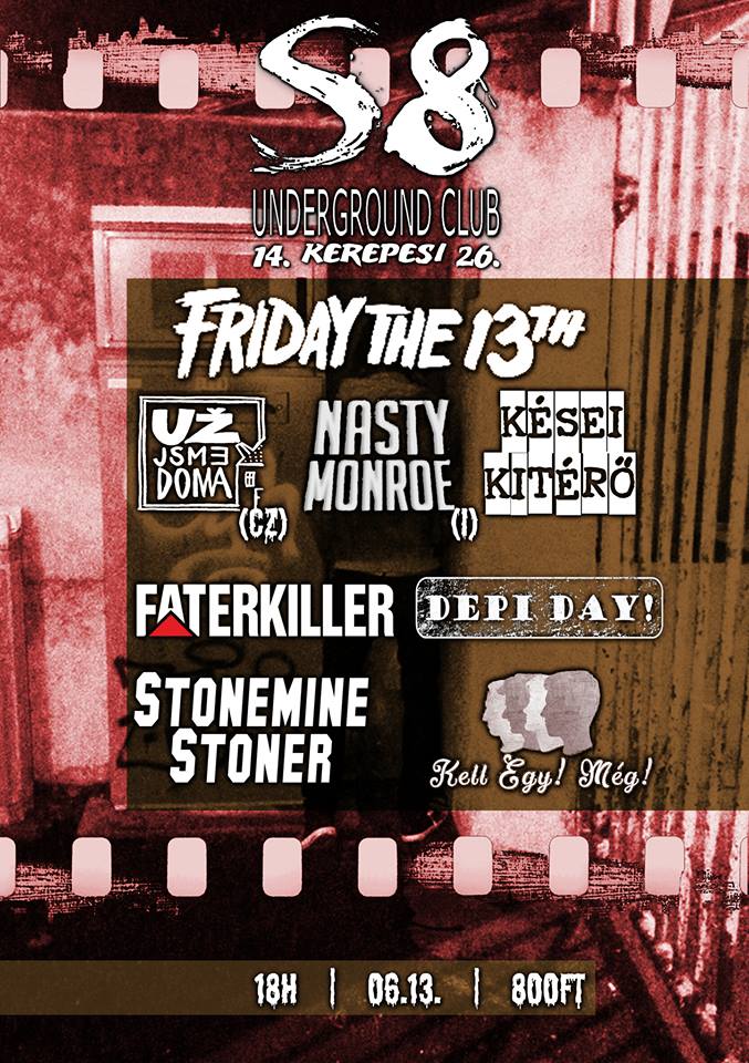 Rendhagyó punk, hard rock és alternatív esttel ünnepeljük péntek 13-át a fővárosi S8 Underground Clubban. Az öt hazai fellépőt a cseh Už jsme doma és az olasz Nasty Monroe erősíti. A megjelenés ajánlott, ugyanis a klub létra- és macskamentes, így garantáltan nem érhet balszerencse! A koncertek után sem kell sietnetek sehova, a jó sörhöz felvételről szól majd a nóta!