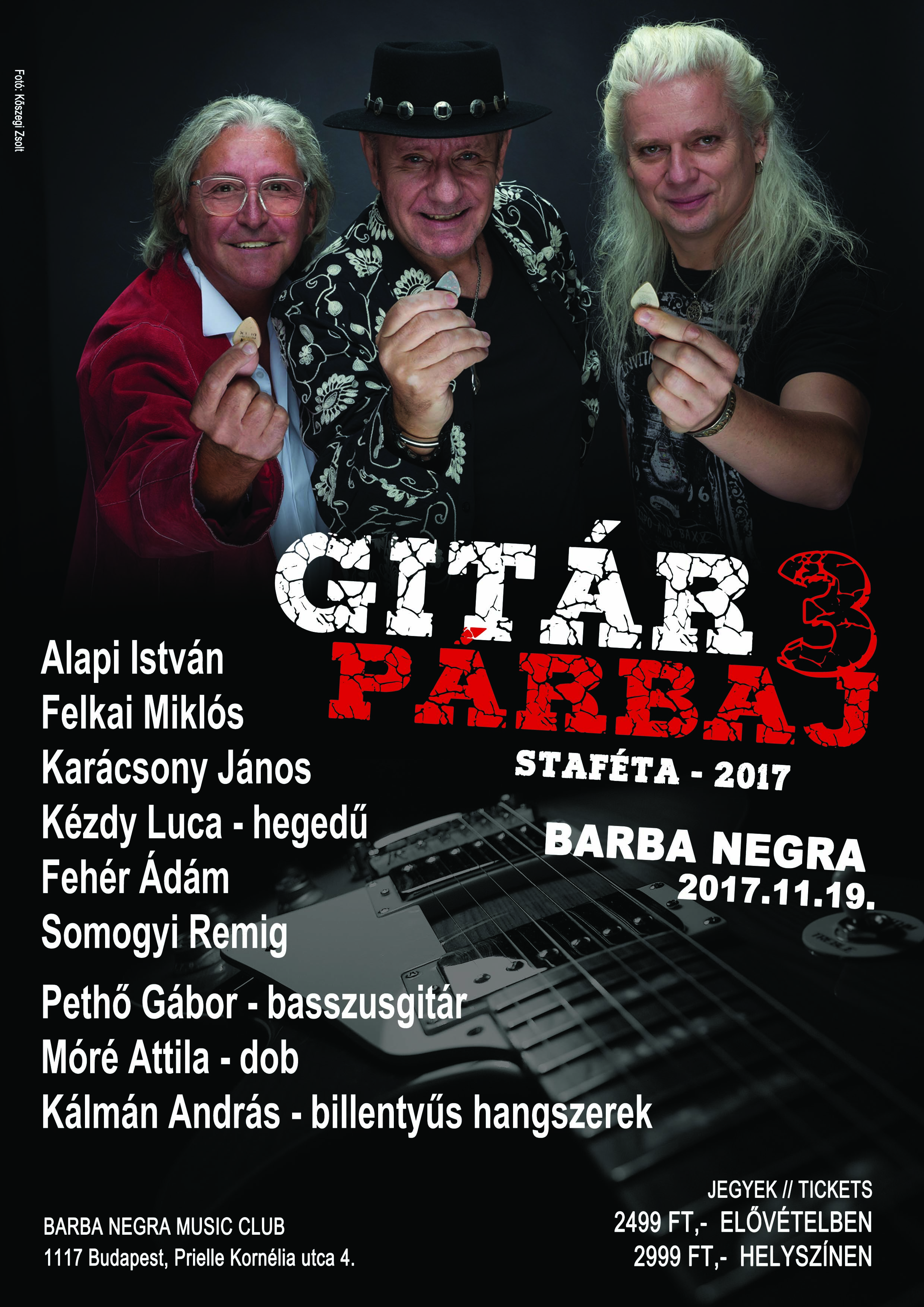 A Gitárpárbaj koncert helyszíne és időpontja: Barba Negra Music Club, 2017, november 19. 20 óra (kapunyitás 19 óra). Jegyek elővételben az előadást megelőző nap éjfélig 2.499.-Ft-os árban a Barba Negra pénztárában és az interneten, valamint az előadás napján, a helyszínen, 2.999.-Ft-ért kaphatók.