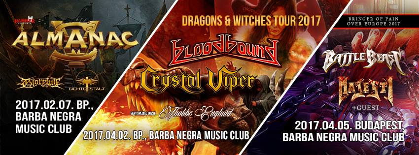 Az áprilist a Bloodbound nyitja. War Of Dragons címmel február 24-én jelenik meg a power metalos svéd zenekar hetedik nagylemeze, a 2014-es Stormborn folytatása. Az új albummal 2017 tavaszán Európa-turnéra indulnak, méghozzá a lengyel Crystal Viper és az ex-Sabaton gitáros, Thobbe Englund társaságában. A budapesti buli másodikán, a Barba Negra-ban lesz!