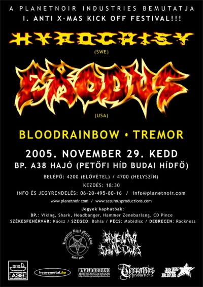 A 2005-ös esztendő eddig sem volt szegényes extrem metal eseményekben, november 29-én pedig újabb egy erős este vár ránk az A38-on: az I. Anti X-mas kick off Festival keretében a Hypocrisy, az Exodus, a Khold, a Bloodrainbow és a Tremor koncertezik majd.