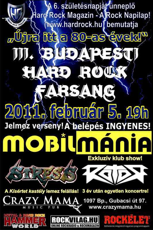 …a már lassan hagyományosnak mondható Budapesti Hard Rock Farsanggal ünnepeljük! Idén egy időutazásra invitálunk mindenkit, ugyanis a rendezvény alcíme„Újra itt a 80-as évek!”. Az estére három különleges előadással lepjük meg a közönséget. Velünk lesz a már évek óta aktívan nem működő és kizárólag ezen az estén igen érdekes felállással újra együtt muzsikáló RoTor, Magyarország első heavy metal zenekara a Stress, akik azzal a meglepetéssel készülnek, hogy a III. Budapesti Hard Rock Farsang kedvéért a ’Kísértet Kastély’ lemez felállású bandával lépnek színpadra. És, hogy ne csak a heavy metal zene szerelmesei legyenek elkényeztetve, a hard rockot a Mobilmánia fogja képviselni, akik kizárólag erre az estére egy megismételhetetlen exkluzív klub show-val készülnek. Természetesen ezeken kívül is lesznek még meglepetések, melyekről azonban majd a későbbiekben ejtünk szót. Viszont egy nagyon fontos információt még meg kell osszunk a nagyérdeművel. Akik ott voltak a 80-as évek koncertjein, azok tudják, az előadások pontosan 19 órakor kezdődtek. Ezt a hagyományt is szeretnénk feleleveníteni, már csak azért is, mert így is hosszú estének ígérkezik a III. Budapesti Hard Rock Farsang!