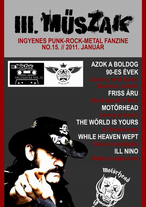 Az idei karácsony sem múlhat el Műszak nélkül, itt a 15-ös szám, mellyel a 65. életévét betöltő Motörhead-főnők, Ian Fraser Kilmister, azaz Lemmy előtt tisztelgünk, akinek tekintete elől immár senki sem menekülhet. Vele olvashattok egy honosított interjút a friss lemez, a The Wörld Is Yours kapcsán, melyet mindemellett ízekre szedtünk a szerkesztőségi boncasztalon. A másik nagy dobásunk erre a hónapra az Ill Nino frontemberével Cristian Machado-val folytatott eszmecsere importálása, hisz’ nemrég ők is friss anyaggal jelentkeztek, amiről a Friss áru rovatban is olvashattok. A While Heaven Wept, az amerikai doom-metal zenekar is bemutatkozik a III. Műszak hasábjain, rájuk is érdemes odafigyelni. Most is szemeztünk a 90-es évek lemezeiből, a Carmen, a Junkies, az Ektomorf és a Neck Sprain egy-egy cuccát pörgettük meg újra. Az újdonságok közül a Blind Myself Szumma válogatását hallgattuk meg, brutális! Keresd motörheades videóösszeállításunkat a YouTube-on, friss zöldségeinket a Facebook-on és kövess minket a Twitter-en is! Idén a Jézuska és a III. Műszak összefogott és közösen ajándékoznak! Ha unod a Backyard Babiest meg a Hellacopterst vagy csak kíváncsi vagy egy tökös magyar rocknroll bandára, ajánljuk figyelmedbe a székesfehérvári The Joystix első lemezét, azaz az ehavi mellékletet, kötelező hallgatnivaló! A kazetta mellett találtok 2011-es műszakos naptár-háttérképet is!!! Röhej, de mindez totál ingyen, itt: www.myspace.com/iii.muszak. Boldog és kellemes mindent mindenkinek!