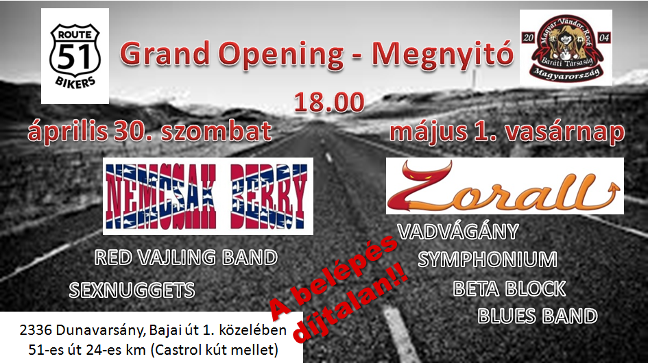 Ma, vagyis április 30-án, szombaton, és május 1-én, vasárnap ingyenes szezonnyitóra várnak mindenkit szeretettel Dunavarsányba, a Route 51-be. Az első nap főbandája a Nemcsak Berry lesz, de a fellépők sorát erősíti még a Red Vajling Band és a Sexnuggets is. Másnap, május első napján a főprodukció a Zorall lesz, de előttük is érdemes lesz a helyszínre érkezni, hiszen színpadra lép még a Vadvágány, a Symphonium és a Beta Block Blues Band is. A rendezvény ingyenes!