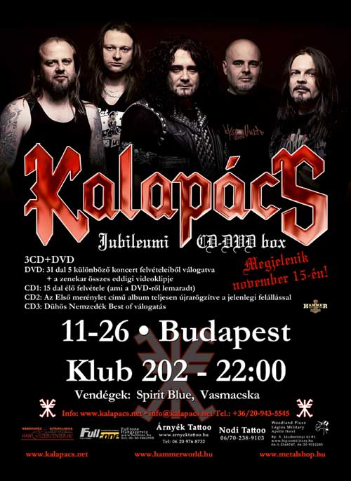 Ha most péntekre még nincs senkinek programja, a Club 202 a tizedik jubileumi Kalapács koncertre várja a látogatókat a Fehérvári úton. A november 15-én megjelent jubileumi CD-DVD box megjelenési ünneplésére is itt kerül majd sor. A DVD-n harmincegy koncertfelvételes dal és a zenekar videóklippjei találhatók, az első CD-n a DVD-ről lemaradt tizenöt élő felvételes dal, a második CD-n az Első merénylet c. album újrarögzített változata, a harmadik CD-n pedig egy válogatás hallható. A hangulat minden téren való bemelegítéséről a csak hölgyekből álló Vasmacska és a csak férfiakból álló Blue Spirit nevezetű formációk gondolkodnak majd.