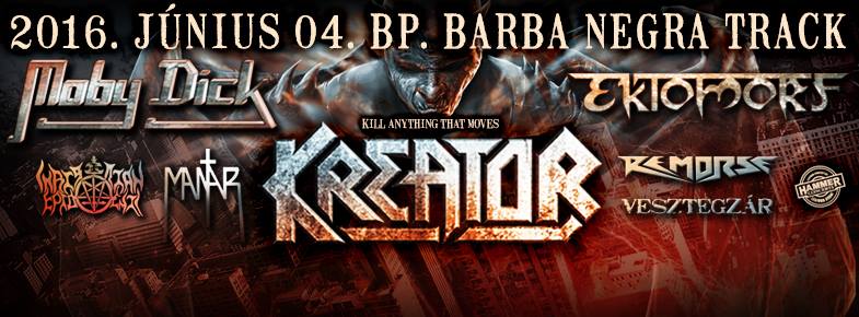 Bár új lemezzel legkorábban csak jövőre jelentkezik a német thrash vonal vezető bandája, a Kreator, azért a turnézást nem hanyagolják. Szerencsére minket sem hagynak ki a szórásból, így a Hammer Concerts szervezésében két évvel a Rockpartos bulija után visszatér Magyarországra a banda. A koncert a Barba Negra Trackben lesz június 4-én. Eddig úgy volt, hogy különleges vendégként csupán a hazai thrash helytartó, a 35 éves Moby Dick játszik majd Milléékkel, mostanra azonban kiderült, hogy több másik csapat csatlakozásával szabályos minifesztivállá alakult az esemény. Íme a részletes program: