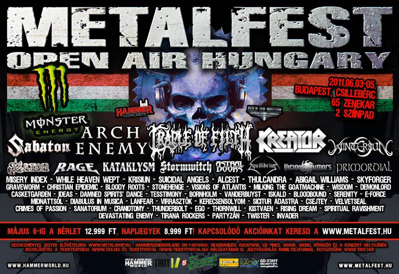 Kreator, Cradle Of Filth, Arch Enemy, Sabaton, Wintersun, Saxon, Rage, Stormwitch, Kataklysm, Primordial, Equilibrium, Misery Index, Vicious Rumors, While Heaven Wept, Astral Doors, Skyforger, Krisiun, Suicidal Angels, Alcest, Thulcandra, Abigail Williams, Graveworm, Christian Epidemic, Stonehenge, Bloody Roots, Visions Of Atlantis, Milking The Goatmachine, Wisdom, Demonlord, CasketGarden, Damned Spirits’ Dance, Tesstimony, Bornholm, Magma Rise,Vanderbuyst, Iskald, Serenity, E-Force, Midnattsól, Diabulus in Musica, Lanfear, Virrasztók, Kerecsensólyom, Chromnology, Sicitur Adastra, Csejtey, VelvetSeal, Crimes Of Passion, Thunderbolt, EGO, Sanatorium, Craniotomy, Devastating Enemy, Ideas, Partyzan, Thornwill, Spirititual Ravisment, Kistvaen, Rising Dream, Tirana Rockers, Twister, Invader, Superheroes és Hammer Gitárhős eredményhirdetés.