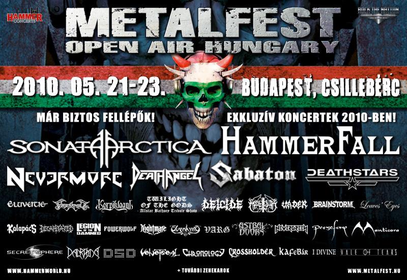 Hammerfall, Sonata Arctica, Nevermore, Sabaton, Finntroll, Korpiklaani, Death Angel,Deicide, Deathstars, Marduk, Vader, Eluveitie, Brainstorm, Leaves’ Eyes, Kalapács, Nevergreen, Legion Of The Damned, Decapitated, Powerwolf, Varg, Vale of Tears, I Divine, Twilight of the Gods – Allstar Bathory Tribute (Primordial, Immortal, Dimmu Borgir, Cradle Of Filth, Thyrfing zenészekkel!),Astral Doors, Nightmare, Elvenking, Manticora, Persefone!!