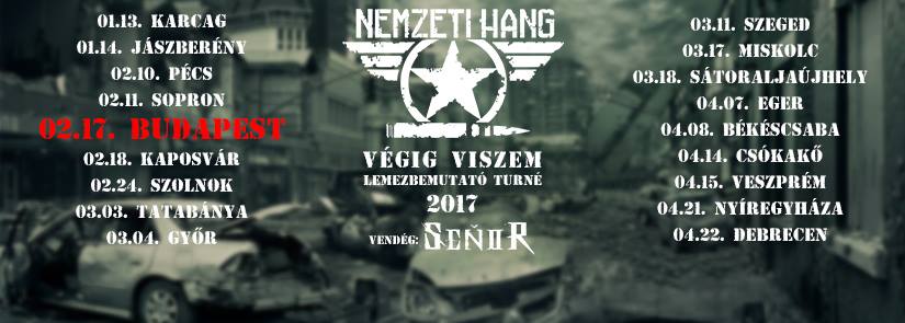 A 2009-ben alakult hajdúszoboszlói Nemzeti Hang zenekar legutóbbi nagylemeze, a Végig viszem 2015 novemberében jelent meg. A csapat most új nagylemezen dolgozik, de arra is maradt energiájuk, hogy leszervezzék első országos lemezbemutató turnéjukat. A turné február 17-én éri el a fővárost, a koncert a Székely Bujdosó vendéglőben lesz, vendégzenekarként pedig a karcagi SenoR játszik.