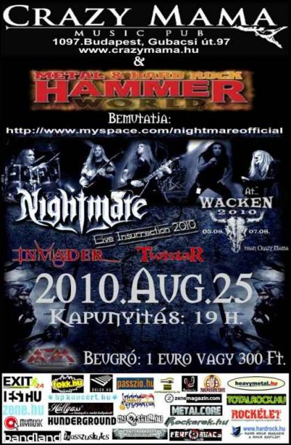 A fesztiválszezont ezen a hétvégén egy Wackenes fellépéssel zárják, ám egy repülőtéri menetrend változás folytán augusztus 25-én Budapesten töltenek egy estét, és úgy gondolták, hogy a MetalFestes ízelítő után ennél nem is adódhat jobb alkalom egy teljes Nightmare bulira! A koncert a Crazy Mama klubban kerül megrendezésre. Ráadásul a zenekar, a Hammer Concerts és a Crazy Mama összefogása révén a koncertet szinte ingyen, jelképes 1 eurós belépővel lehet meglátogatni (természetesen forinttal is lehet fizetni, ekkor 300 Ft a belépő). A hó és nyár végi kiapadt pénztárcákat kímélő jegyáras akció sikere esetén hasonló 1 Eurós bulik a későbbikben is várhatóak. Az este két hazai vendége a felfrissült tagságú Invader és a friss EP-vel jelentkező Twister.