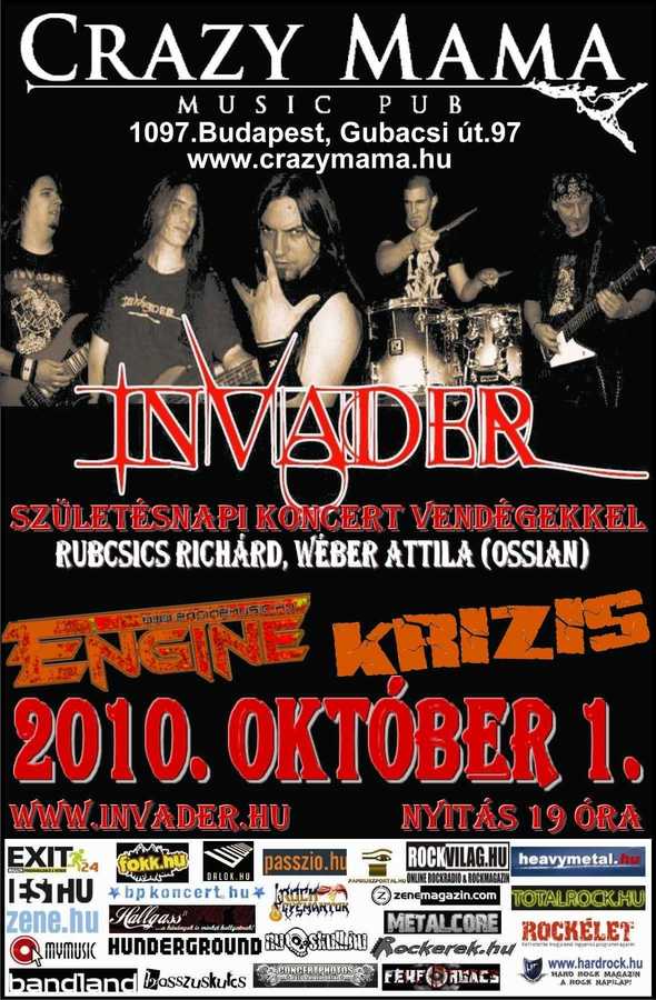 Október 1.-én szeretettel várunk a Crazy Mama Klubban az INVADER zenekar 5. születésnapi koncertjén, ahol a teljes 2010-es EP anyag, és a két, már nem is annyira új tag bemutatása mellett neves vendégek is fellépnek velünk: Rubcsics Richárd és Wéber Attila az Ossian zenekar gitárosai! A programot az Engine és a Krízis zenekar teszi teljessé. Ízelitő a tavalyi szülinapi buliból (vendég: Kalapács József, Sárközi Lajos)