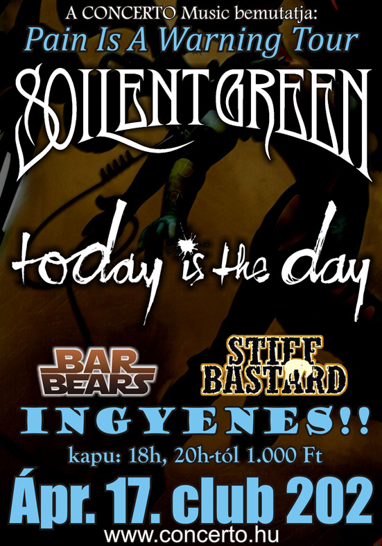 Április 17-én, vasárnap, kihagyhatatlan ingyenes bulival várja a durva zenék híveit a Club 202: a CONCERTO Music szervezésében együtt koncertezik a klubban a louisianai színtér egyik underground hőse, a Soilent Green és a nehezen kategorizálható Today Is The Day. A Soilent Green 1988-ban alakult, bemutatkozó lemezük Pussysoul címmel jelent meg 1995-ben, utolsó megnyilvánulásuk pedig az Inevitable Collapse In The Presence Of Conviction címmel jött ki 2008-ban. A sludge és a grindcore sajátos ötvözetében utazó banda két alapítótagja a Crowbar jelenlegi felállásában is érdekelt Tommy Buckley dobos, illetve Brian Patton gitáros, akik társaikkal, Ben Falgoust énekessel és Scott Crochet basszusgitárossal bizonyára mind az öt nagylemezről ízelítőt adnak majd a koncerten.