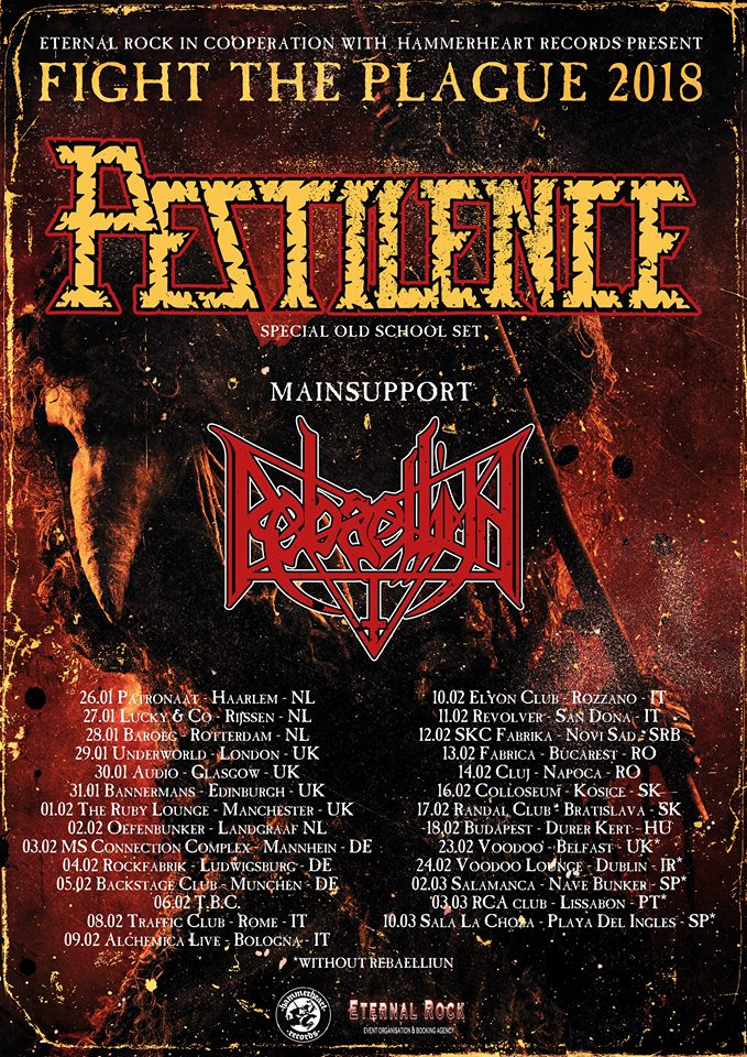 A technikás death metal alapcsapat fennállása legfontosabb szerzeményeit 1986 és 1994 között szállította le, majd azt követően tizennégy év szünet után 2008-ban tértek vissza két őstaggal (Patrick Mameli, Patrick Uterwijk). A banda az újjáalakulást követően három nagylemezt adott ki, legutoljára 2013-ban az Obsideot. A lemez megjelenése után a Pestilence főnöke, alapítója, az énekes/gitáros Patrick Mameli ugyan egy rövid időre jegelte a bandát, de január végén Európa-turnéra indul a holland death metal legenda, méghozzá különleges programmal, ugyanis a spéci old school műsorban az első négy klasszikus albumukról fognak játszani: Malleus Maleficarum, Consuming Impulse, Testimony Of The Ancients és Spheres. A körút vendége a death metalos brazil Rebaelliun lesz, akik tavaly adták ki a The Hell’s Decrees című harmadik albumukat. Lesz magyar állomás is: február 18-án a Dürer Kertben.