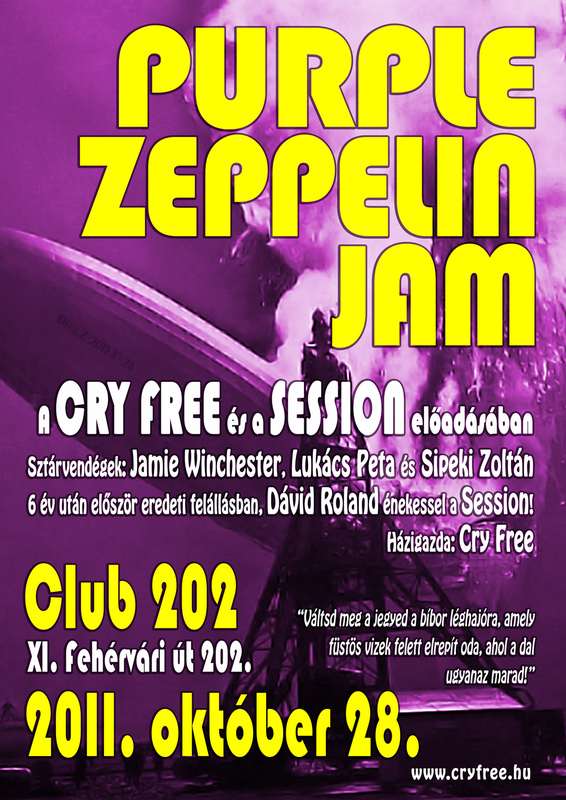 De mit is takar ez a hangzatos titulus? A “Purple”-t és a “Zeppelin”-t még értjük, de mi ez a “Jam”? Egy flancos angolszász kifejezés a “koncert” szó helyett, vagy esetleg a “dzsemmelésként” emlegetett örömzenére utal? Mindkettő. A brit rockzene két valaha létezett legnagyobb óriása által ránk hagyott zenei anyag élő bemutatása, és egy zenekarokon átívelő önfeledt együttmuzsikálás, melynek során a Cry Free és a Session tagjai vendégeikkel együtt végtelen számú spontán kötelékbe rendeződve ünneplik hőseiket muzikális értelemben. A 3 órás műsorban felcsendülnek a két rockóriás legnagyobb himnuszai, néhány ritkaság a vájtfülűek számára, és egy igazi meglepetés kettejük “metszethalmazából”. Valódi örömünnep várható tehát 2011. október 28-án a Club 202-ben (ex-Wigwam), amelyről a 70-es évek rockzenéjének igazi rajongói nem hiányozhatnak!