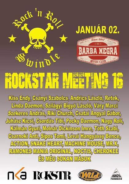 Hol máshol is kezdhetnénk az újévet, mint a hagyományos Rock ‘n Roll Swindle évnyitón, a Barba Negrában. Január 2-án kerül megrendezésre a Rockstar Meeting, és ahogy már megszokhattuk, most is a fellépők sorát erősíti a hazai rock és metalélet színe-java. A fellépő zenekarok között találjuk az Actiont, az eredeti Ramones Maniat, a Machine Mouset, a Mr. X zenekart, a Cherokeet, a Noctist, és a SnakeHeart is színpadra lép néhány dal erejéig.