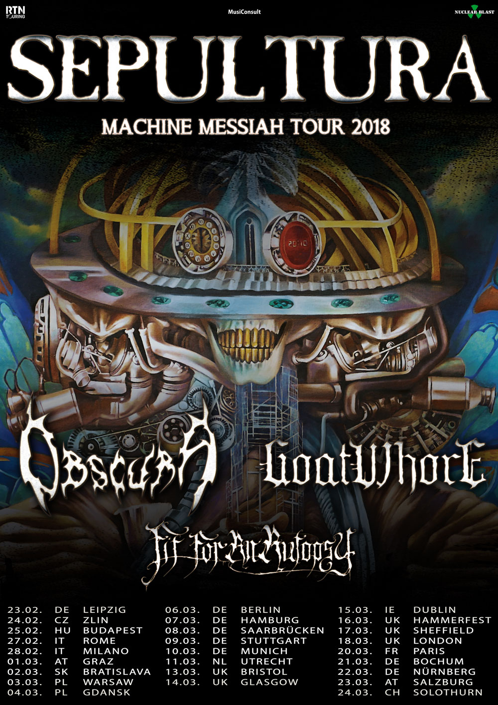 A Machine Messiah turné február 25-én érkezik a Barba Negrába és a Sepultura három remek bandát is magával hoz majd, a progos, technikás death metalt játszó német Obscurát, az Acid Bath egykori riffmestereként és a Crowbar ex-gitárosaként ismert Sammy Pierre Duet és a Soilent Greenből ismert L. Ben Falgoust II énekes vezette New Orleans-i black/thrash/death vonalas Goatwhore-t és az amerikai deathcore horda Fit For An Autopsy-t.