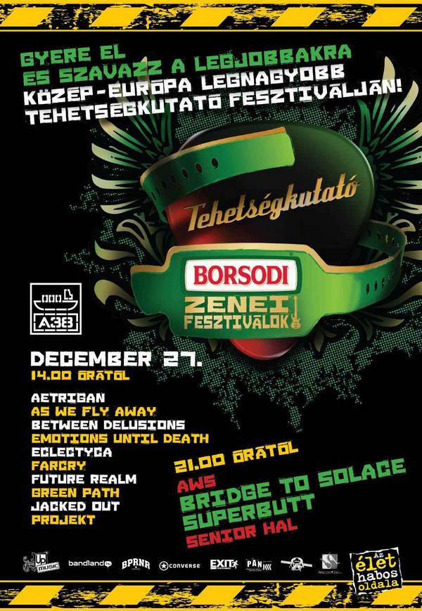 Utolsó forduló a 2009-es Borsodi Zenei Fesztiválok Tehetségkutatón. December 27-én rendezik meg az utolsó fordulót az idei Borsodi Zenei Fesztiválok Tehetségkutatóból a budapesti A38 Hajón. Az utolsó napon, hasonlóan az elsőhöz, metálzenekarok csapnak össze a színpadon, szám szerint tízen. A délután kettőkor kezdődő tehetségkutató után nem lesz vége a programnak, ugyanis itt adja hagyományos évvégi koncertjét a számtalan európai turnén túl levő Superbutt, akiknek legutóbbi nagylemeze, a You And Your Revolution néhány hete jelent meg Németországban, és a zenekar Facebook-oldalán belinkelt szép számú külföldi recenzió tanúsága alapján a kinti kritikusok eddig nagyon jól fogadják az anyagot. Bár a Superbutt nyár óta nem játszott Budapesten, a hírek szerint az év elején részben lecserélődött tagságú zenekar új felállása masszívan összeérett. Erről a szóban forgó koncerten túl feltehetően a hamarosan – még karácsony előtt – bemutatandó új, a Clawfinger-énekes Zak Tell vendégszereplésével készült Last Call videoklipből is meggyőződhet minden érdeklődő.