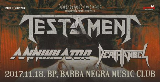 Nagy örömünkre szolgál bejelenteni, hogy három, műfajában külön-külön is kultikus zenekar állt össze egy masszív őszi európai körútra. A Bay Area thrasher óriás Testament legutóbbi lemezének címét viselő, “Brotherhood Of The Snake” turné vendégzenekarai az úgyszintén Bay Area-béli Death Angel, valamint a  Jeff Waters vezette kanadai Annihilator.