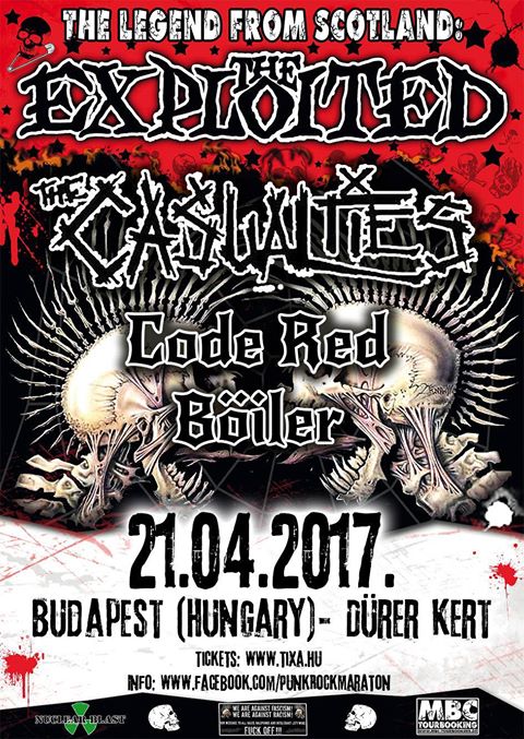 Idén ünnepli hatvanadik születésnapját Wattie Buchan, a The Exploited örökifjú legendája, ennek apropójaként a banda szülinapi turnén köszönti frontemberét. Mi is együtt ünnepelhetünk a punk legendákkal, mert a turné egyik állomása a Dürer Kert lesz. Április 21-én a The Exploited mellett egy másik punklegendát is köszönthetünk. Az est másik fénypontja a Jorge Herrera vezette amerikai street punk rocker The Casualties lesz. A The Exploited már évek óta dolgozik egy új nagylemezen, amely az első lesz a sorban a 2003-as Fuck The System óta – konkrét megjelenési dátummal még mindig nem szolgálhatunk, ami viszont a The Casualties-t illeti, legutóbbi nagylemezük Chaos Sound címmel kereken egy éve jött ki. A lemez Brothers And Sisters dalához most egy új klip készült el. A budapesti koncerten fellép még a Code Red és a Böiler is.