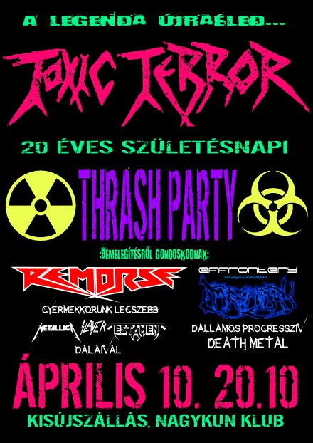 2010 április 10-én, szombaton a kisújszállási Nagykun Klubban fergeteges thrash party-val ünnepli megalakulásának 20. évfordulóját a legendásToxicTerror zenekar. Méghozzá az Effrontery és a Remorse társaságában, némileg egybekötve némelyik tag kisújszállási érettségi találkozójával is. Remek alkalom (főleg a Kisújszállás és környékéről származóknak) hogy rég nem látott barátokkal, elveszettnek hitt fazonokkal találkozzanak, bulizzanak ismét! Az esemény alkalmából póló is készül, amennyiben elnyeri tetszésetek, korlátozott számban a helyszínen megvásárolható lesz (S,M,L,XL,XXL méretekben). Alábbi linkek egtekinthető, miképp mutat.