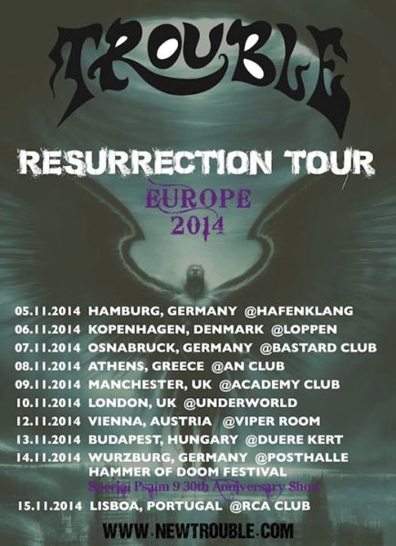 November 5-én, Hamburgban indul a chicagói doom metal legenda Trouble európai turnéja, melyből szerencsére Magyarországot sem hagyták ki. A banda eddig kétszer járt hazánkban, először 2007-ben még Eric Wagnerrel, majd 2009-ben Kory Clarke-kal. November 13-án a Dürer Kertben pedig Kyle Thomas énekessel (Exhorder, Floodgate, Alabama Thunderpussy stb) érkeznek, aki 2012-ben csatlakozott a bandához, így a tavalyi The Distortion Fields című albumon is ő énekel. Rick Wartell gitáros állítása szerint már az új lemezen dolgoznak, azonban csak 2015 második felére várható az új album.