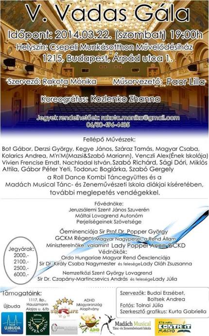Az V. Vadas Gála 2014. március 22-én, Csepelen, a Munkásotthon színháztermében kerül megrendezésre. A fellépők névsora folyamatosan bővül, de eddig a következő művészek lépnek majd a gálán színpadra: Bot Gábor, Derzsi György, Kegye János, Száraz Tamás, M”n”M- Mazsi & Szabó Mariann, Vivien Frencise Erndt, Magyar Csaba, Nachladal István, Kolarics Andrea és Venczli Alex ( Ének iskolájából).