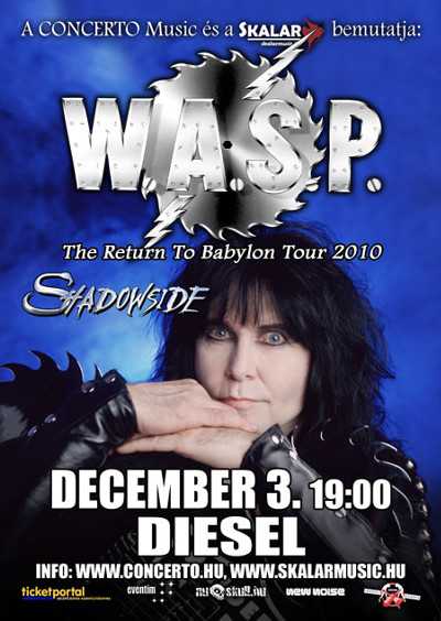Ezen a turnén a női énekessel működő brazil Shadowside lesz a W.A.S.P. kísérője, akik hazájukban már hatalmas népszerűségnek örvendenek. Ha szereted az igazi kemény power metalt, mindenképpen ajánlott időben érkezni! A bulira már nem kell sokat várni, hiszen december 3-án érkeznek a csapatok Budapestre, a Diesel klubba. A belépőjegyeket megválthatjuk szokás szerint a Ticketportal országos hálózatában (beleértve az ismert rockboltokat), vagy akár kezelési költség nélkül a számítógép mellől – otthoni jegynyomtatással – a www.ticketportal.hu weboldalról.
