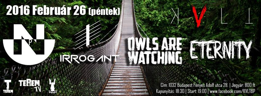 Február 26-án a YUK-ban négy kevésbé ismert, ám de annál tehetségesebb fővárosi csapat mutatja meg magát a nagyközönségnek. A buli délután hétkor kezdődik és egészen estig tart. Nagy pörgés és maximálisra tekert erősítőfejek várhatóak egészen kifulladásig, ugyanis fellép az Irrogant, az Owls Are Watching, a Pinot Noirz és bemutatkozik első koncertjével az Eternity.